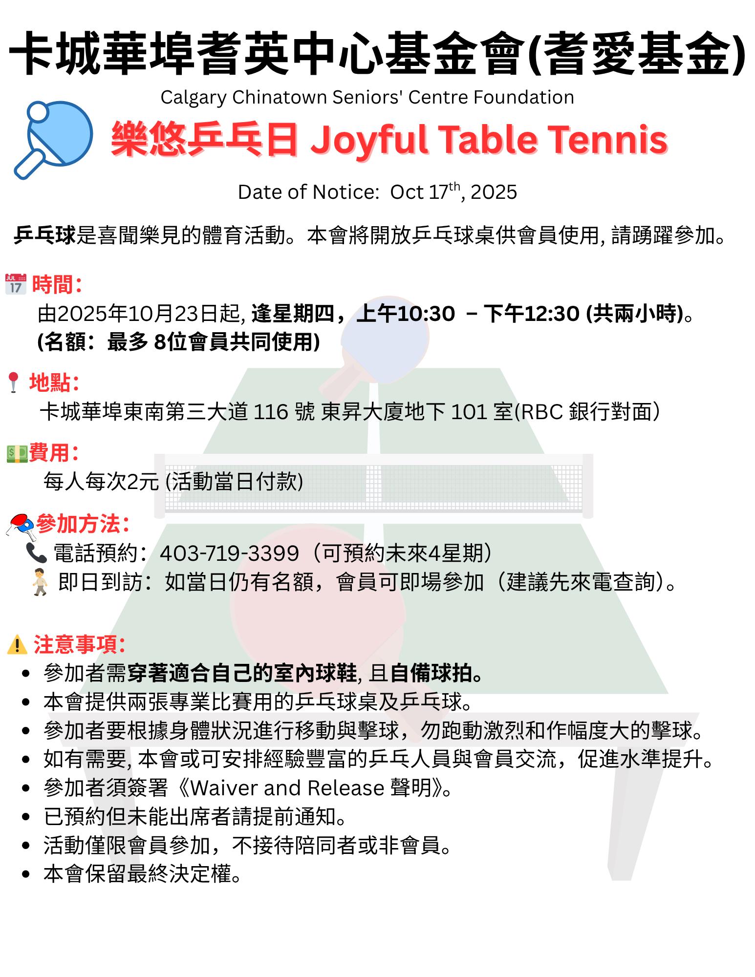 本基金會一直用心為各位會員安排多元又有趣的活動,讓大家可以開心聚會、保持活力!除了早前舉行的「耆英歡唱坊」之外,我們現正舉辦「樂悠乒乓日」,誠邀各位踴躍參加,詳情請參閱最新活動通告。