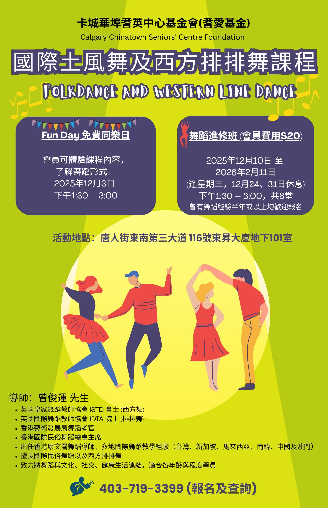 本基金會將於今年12月起舉辦國際土風舞及西方排排舞課程,現有會員只需 $20 即可報名參加,全期共八堂。課程由致力推廣舞蹈藝術的曾俊運先生親自授課。